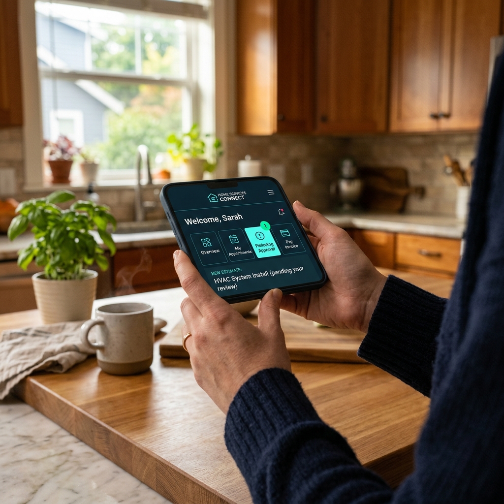 Portal handles: scheduling, payments, estimate approvals, service history.