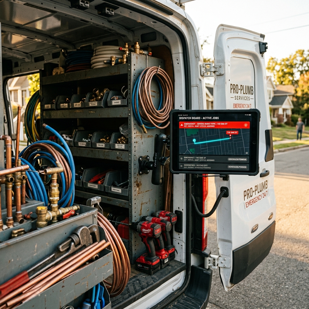 Plumbing companies need emergency dispatch, detailed quoting, and before/after photo documentation.